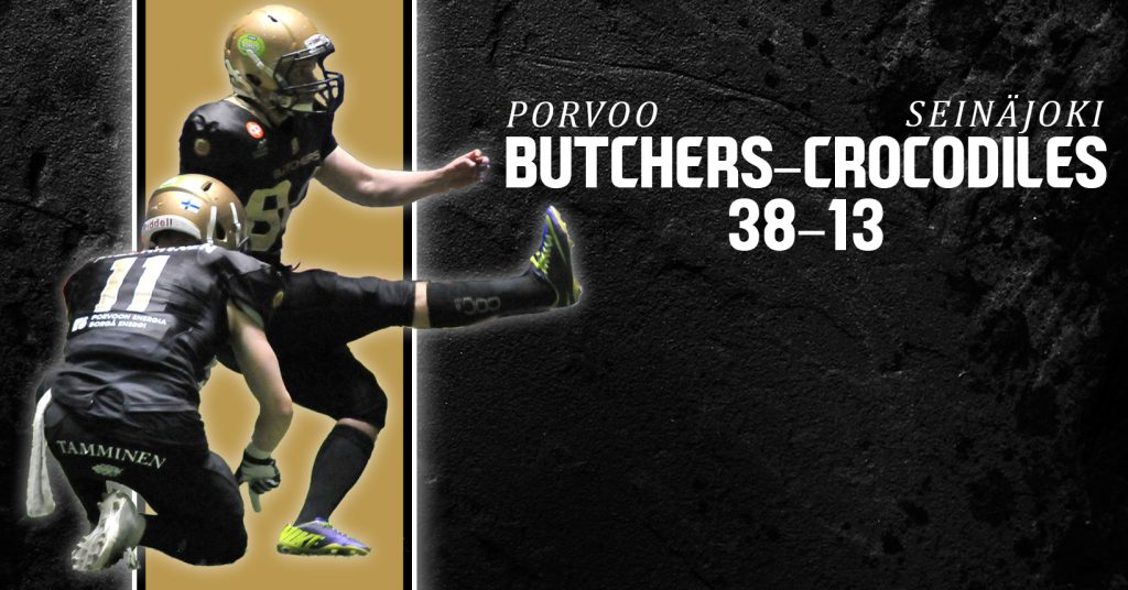 Juoksupeli oli valttia, kun Butchers ja Crocodiles kohtasivat lauantaina. Kotijoukkue juoksi hulppeat 254 jaardia ja kaatoi Crocodilesin lukemin 38–13. Butchersin yhteistyökumppanin tarjoamaa ottelua Porvoon Keskuskentällä seurasi kauden ennätysyleisö, 812 katsojaa.