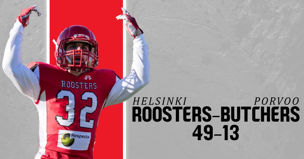 Helsinki Roosters teki maanantaina lopulta sen, mitä moni hallitsevalta mestarilta odottikin: iski taululle lähes 40 pistettä ja karkasi vastustajalta jo taukoon mennessä. Alussa hyvin puolustanut Porvoo Butchers joutui taipumaan Velodromin maanantai-illassa lukemin 49–13 (35–7).