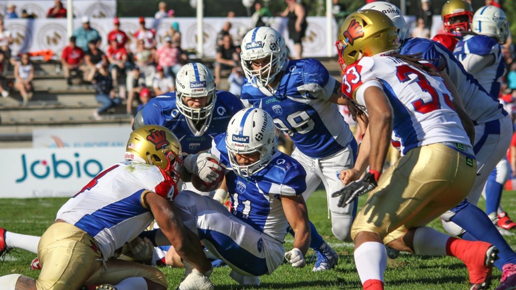 Raleigh Yeldell (5) on torstain pelistä pois. Saintsin juoksua vastaan Martti Kass (97), Lauri Hannula (96) ja Chris Young ovat vahvoja vääntäjiä. Kuva: Harri Koivunen