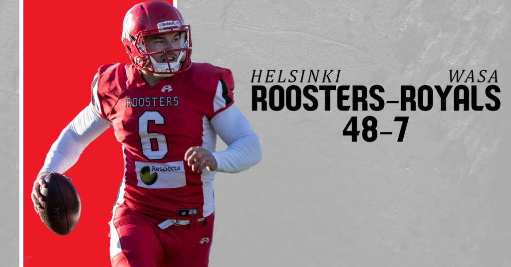 Ajoittain Royals tuntui jo saavan Roostersin juoksupelistä otteen ja erityisesti ranskalaistukimies Steeven Tresfield ja puolustuksen linja saivat pallonkantajia kiinni. Roostersin suoritusvarmuus ja suorittajien laajuus olivat kuitenkin myös juoksupelissä tällä kertaa liikaa. Henri Jussila iski kaksi touchdownia, mutta myös Karri Pajarinen, Alexander Kuronen ja Mourad Daifi saivat jokainen vastuuta.