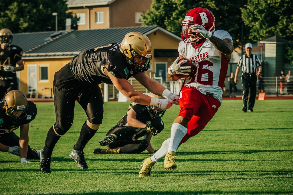 Roostersin Micky Kyei (oik.) teki kauden ensimmäisessä ottelussaan touchdownin ja eteni hyökkäyksessä 86 jaardia. Butchersin Timi Nuikka puolestaan on Vaahteraliigan taklaustilaston kärjessä. (Kuva: Jukka Pinonummi)
