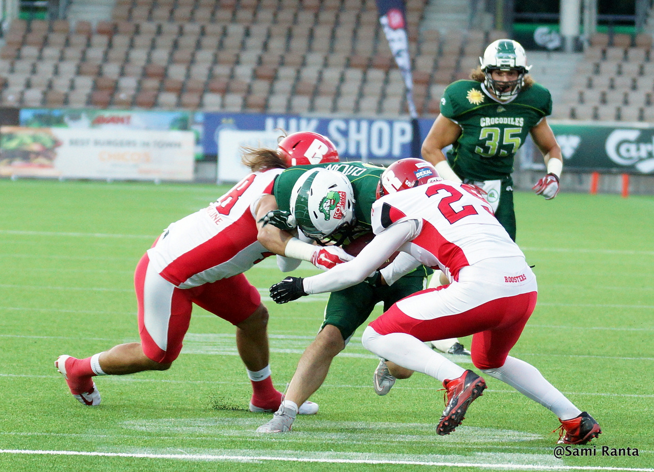 Saalistavat Krokotiilit. Greg Robinson (6) pelasi säästeliäästi Crocodilesin puolustuksessa, mutta osoitti olevansa pelikunnossa. Ranskalaistukimies Matthieu Fayard (40) oli jälleen seinäjokisten taklaustilaston kärkinimi. Kuva: FSC Media / Riku Flink